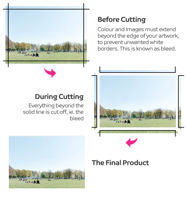 Bleed is the term used for ink that extends past the edge, or trim size - of the page. On any press, there will always be a small amount of movement when a job is printed. If your artwork is only the exact size of the page, you may see a fine white line at the very edge when the page is trimmed. To prevent this, you should always add 3mm bleed to your artwork; that is, make your artwork 3mm wider all round than the trim size of the page.